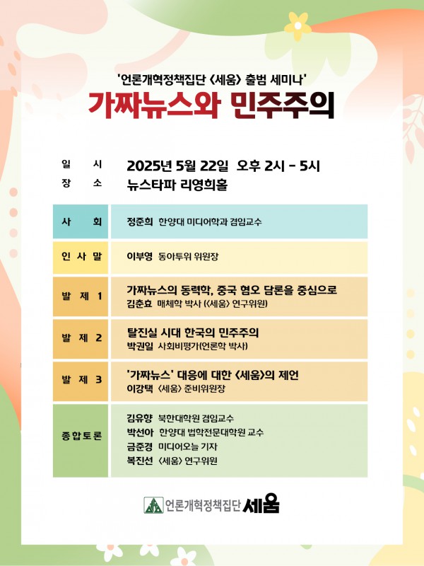 언론개혁정책집단 <세움> 출범 세미나 : 가짜뉴스와 민주주의 페이지 정보 작성자 관리자 작성일25-05-20 14:43 조회758회 관련링크 본문 언로개혁정책집단 <세움> 출범 세미나 개최 관련 안낻입니다. 이전글 다음글 목록