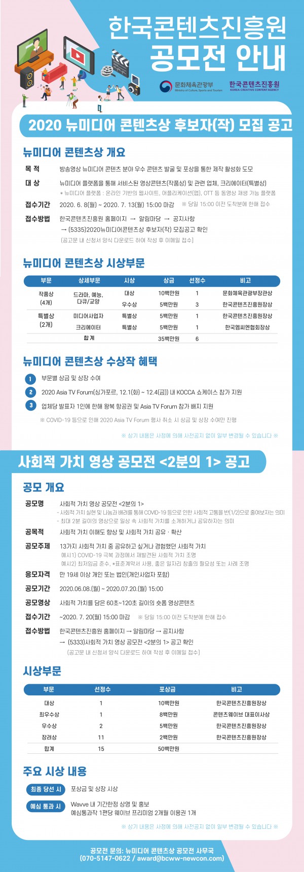 [한국콘텐츠진흥원] 뉴미디어 콘텐츠상 & 사회적 가치 영상 (2분의 1) 공모전 페이지 정보 작성자 관리자 작성일20-06-18 15:50 조회2,347회 관련링크 본문 첨부파일 관련 신청 서류.zip (298.4K) 이전글 다음글 목록