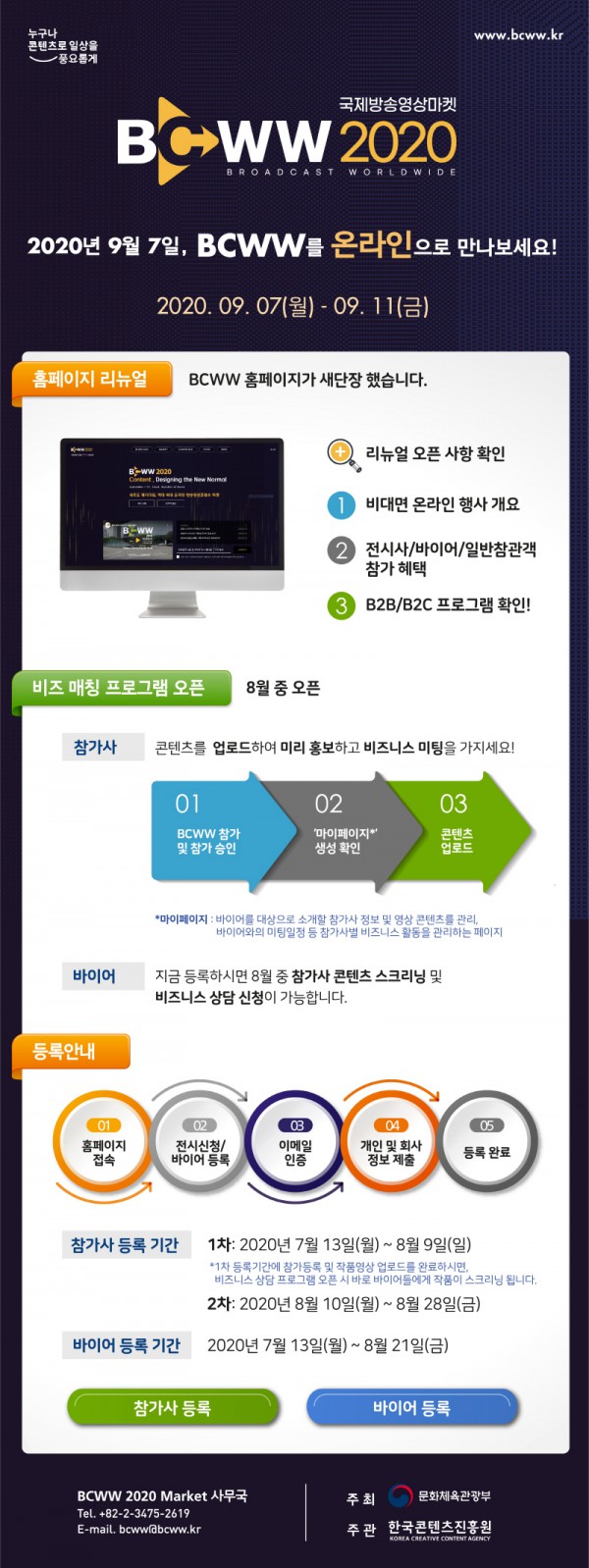 [한국콘텐츠진흥원] BCWW 2020 국제방송영상마켓 참가사바이어 등록 안내 페이지 정보 작성자 관리자 작성일20-08-11 08:36 조회2,312회 관련링크 본문 자세한 내용은 해당 링크를 참조하여 주시기 바랍니다. 이전글 다음글 목록