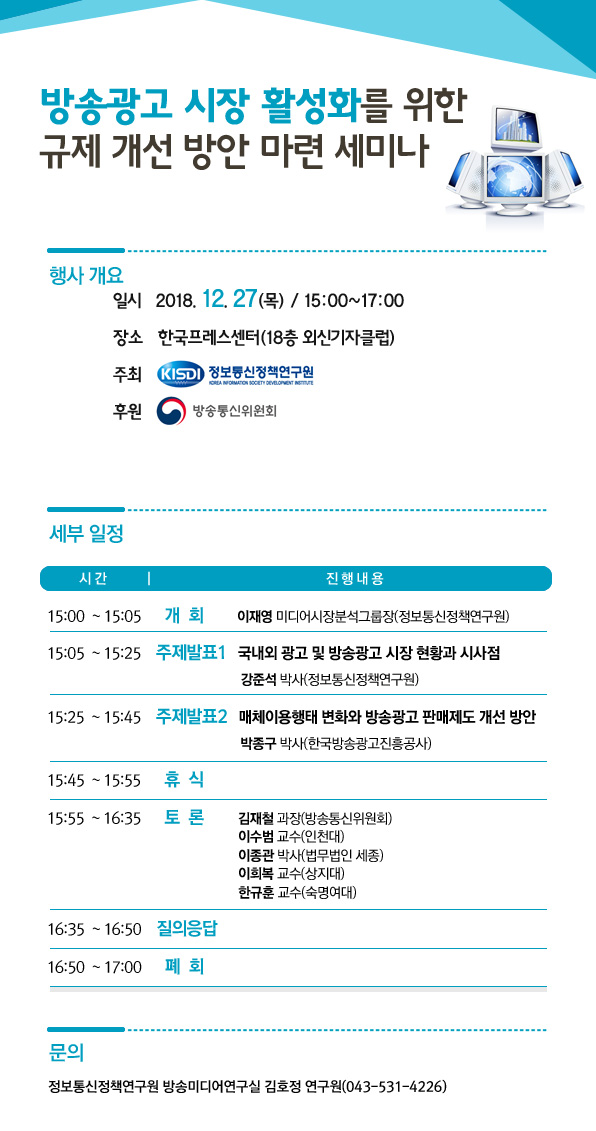 [정보통신정책연구원] '방송광고 시장 활성화를 위한 규제 개선 방안 마련 세미나' 개최 안내 페이지 정보 작성자 관리자 작성일18-12-20 10:01 조회2,835회 관련링크 본문 이전글 다음글 목록