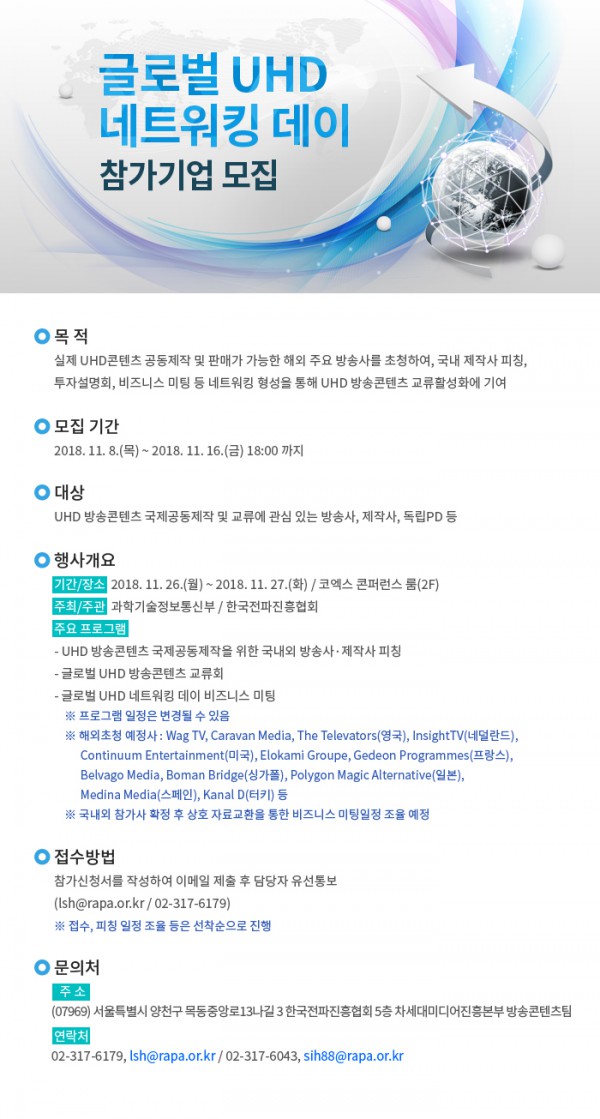 [한국전파진흥협회] 글로벌 UHD 네트워킹 데이 참가기업 모집 페이지 정보 작성자 관리자 작성일18-11-12 13:47 조회3,154회 관련링크 본문 첨부파일 글로벌 UHD 네트워킹 데이 참가신청서 양식.hwp (13.5K) 이전글 다음글 목록