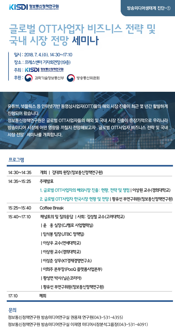 [정보통신정책연구원] '글로벌 OTT사업자 비즈니스 전략 및 국내 시장 전망 세미나' 개최 안내 페이지 정보 작성자 관리자 작성일18-06-22 09:01 조회3,130회 관련링크 본문 이전글 다음글 목록