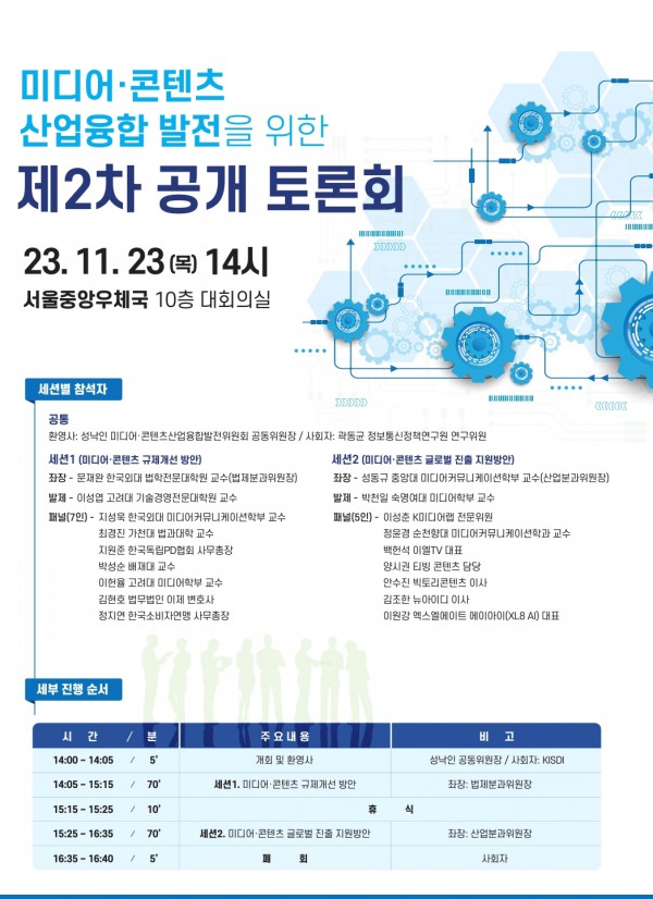 미디어·콘텐츠 산업융합 발전을 위한 제2차 공개 토론회 페이지 정보 작성자 관리자 작성일23-11-20 09:50 조회1,872회 관련링크 본문 "미디어·콘텐츠 산업융합 발전을 위한 제2차 공개 토론회" 관련 안내입니다. 이전글 다음글 목록