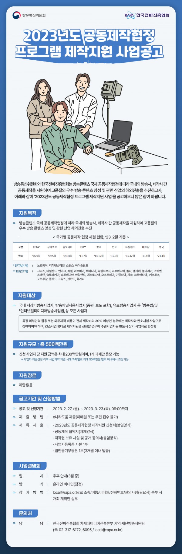 [방송통신위원회] 2023 공동제작협정 제작지원 사업 공고 페이지 정보 작성자 관리자 작성일23-03-06 09:10 조회1,845회 관련링크 본문 첨부파일 붙임2. 2023년도 공동제작협정 제작지원 수행지침.pdf (920.9K) 붙임3. 2023년 공동제작협정 제작지원 사업 작성 양식.hwp (86.0K) 이전글 다음글 목록