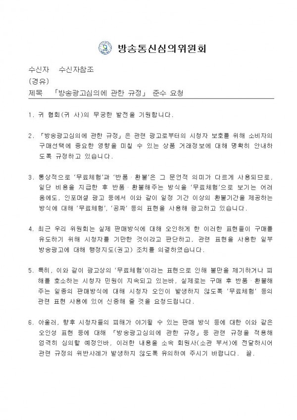 [방송통신심의위원회] 「방송광고심의에 관한 규정」 준수 요청 페이지 정보 작성자 관리자 작성일23-04-19 09:04 조회1,717회 관련링크 본문 방송통신심의위원회 『방송광고 심의에 관한 규정』 관련 준수 요청 사항입니다.참고하여 주시기 바랍니다. 이전글 다음글 목록