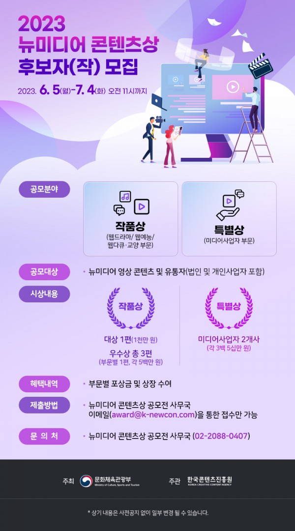 [한국콘텐츠진흥원] 2023 뉴미디어 콘텐츠상 공모전 모집 공고 페이지 정보 작성자 관리자 작성일23-06-13 15:38 조회1,725회 관련링크 본문 한국콘텐츠진흥원 <2023 뉴미디어 콘텐츠상> 모집공고 안내입니다.자세한 내용은 한국콘텐츠진흥원 홈페이지를 참조하여 주시기 바랍니다. 이전글 다음글 목록