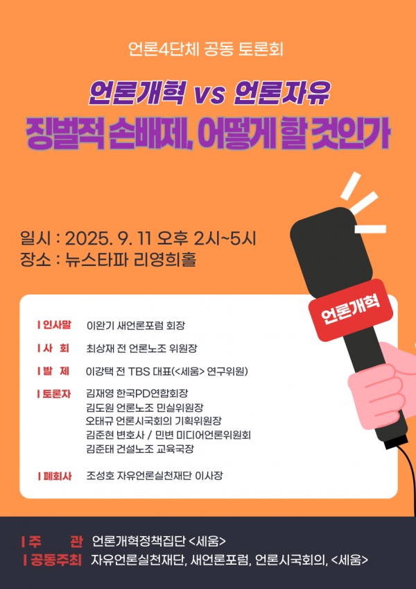 언론4단체 공동 토론회 <징벌적 손배제, 어떻게 할 것인가> 페이지 정보 작성자 관리자 작성일25-09-11 08:28 조회416회 관련링크 본문 포스터를 참조하여 주시기 바랍니다. 이전글 다음글 목록
